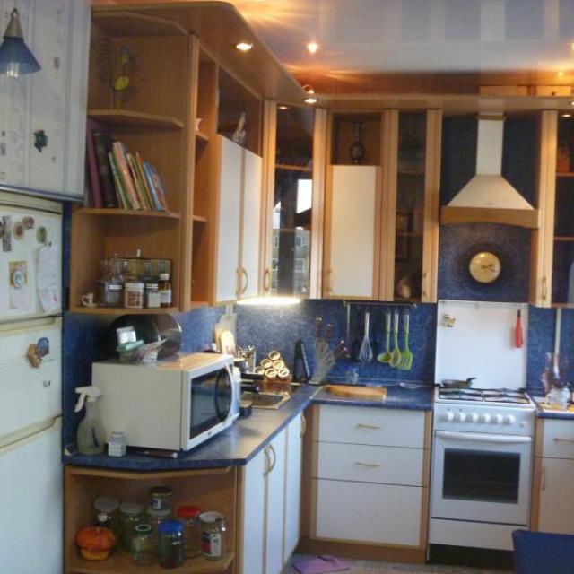 На кухне большой кухонный гарнитур, под подоконником зимний холодильник, натяжной потолок, 2 окна, холодильник вставлен в нишу (с хоз.шкафом над ним).