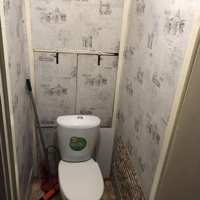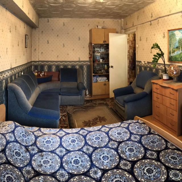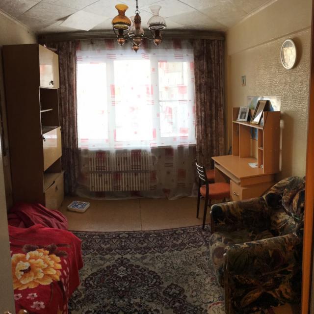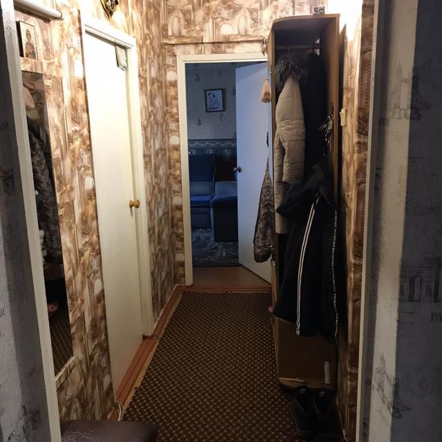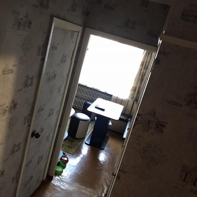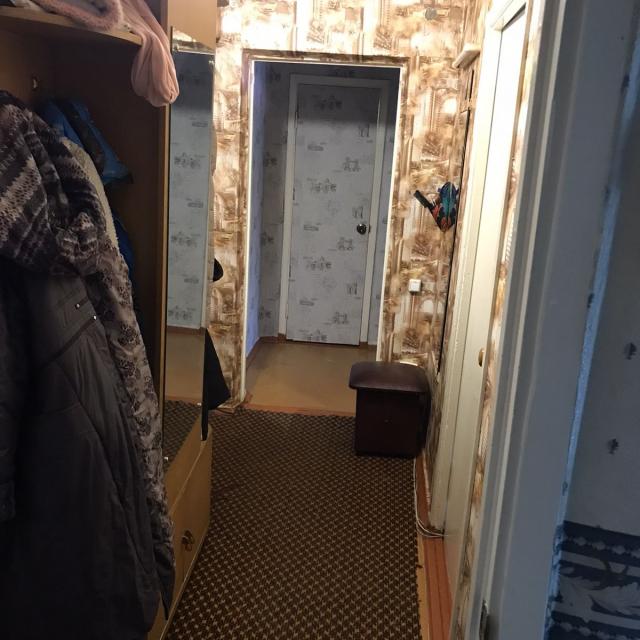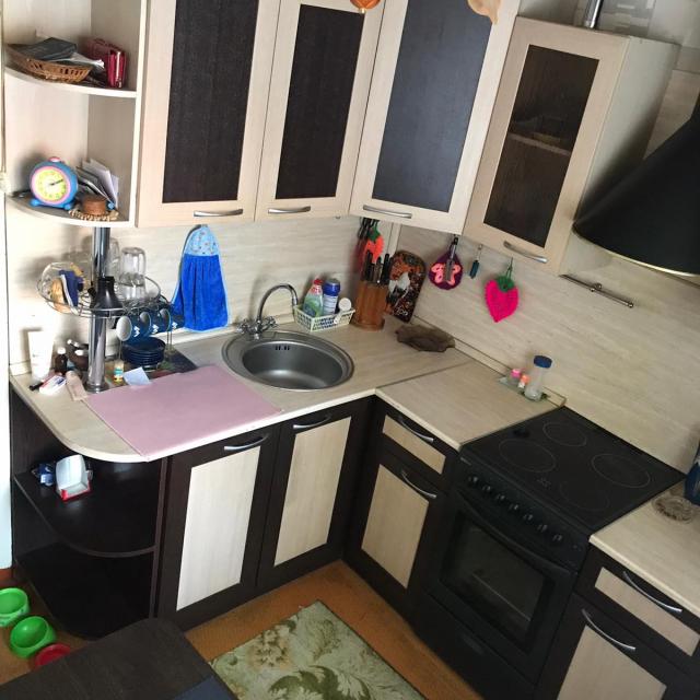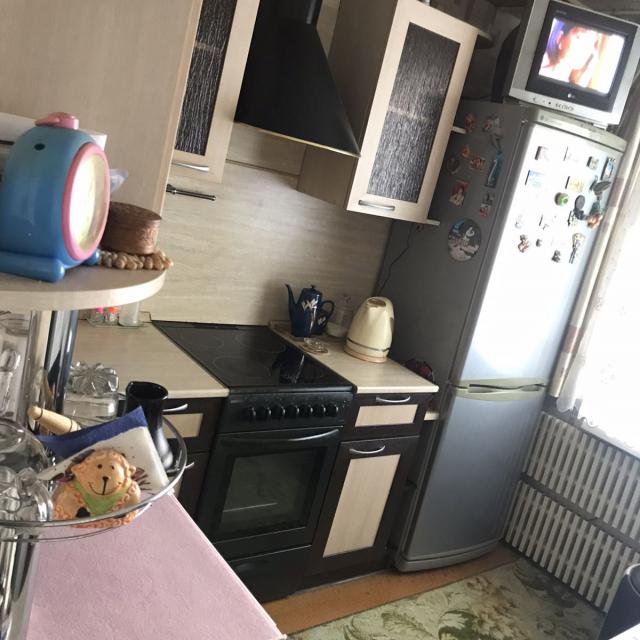 Квартира в нормальном, жилом состоянии (2 стеклопакета, на полу линолеум, на потолке плитка, новый унитаз, счетчики ХГВ, новый электросчетчик, остается встр. кухня+техника), есть отдельная кладовка - увеличенная за счет коридора. Соседей нет, только сверху.