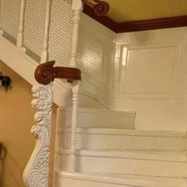 классический евроремонт, однотонные стены, потолок с лепниной, элегантная лестница, арки, камин, встроенные шкафы, встроенный кухонный гарнитур
